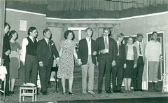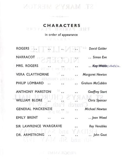 For any amateur society to be able to put on a play with 8 men in it is an achievement indeed and our players are to be congratulated on their casting resources. The play has an improbable plot even for Agatha Christie but our players handled it well. It is perhaps unfair to single out any one or two players for special mention but Roy Venables handled the part of Sir Lawrence Wargrave very well indeed, particularly at the end. In a play which has little genuine humour in it, I very much liked the timing of David Golder's "Breakfast is served", following on a slightly fanatical Old Testament reading ending something like "They have fallen into the pit they have digged for others". I had a delightful feeling that his next words might be, "Shall I serve the gentlemen in the pit ?" ! Margaret Newton and Graham McCubbin did their best with a very small romantic interest and the cast as a whole showed a very good sense of teamwork. It is pleasant to watch a performance where everyone works together. Carol McCubbin deserves a word of praise for her performance. She took over at short notice from Kay Webb, who was indisposed. Other parts were well played by Simon Eve, John Gout, Michael Newton, Chris Spencer, Geoffrey Start and Joan Wood.